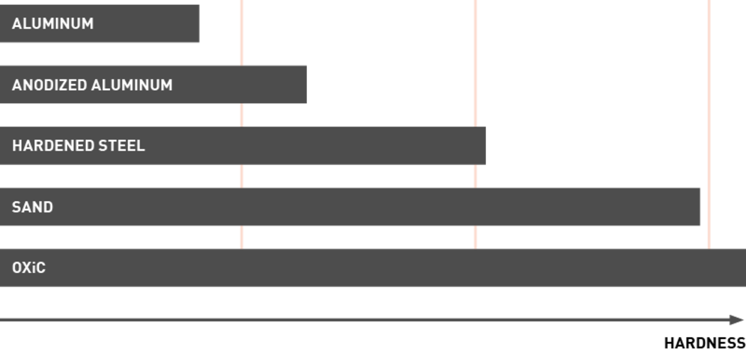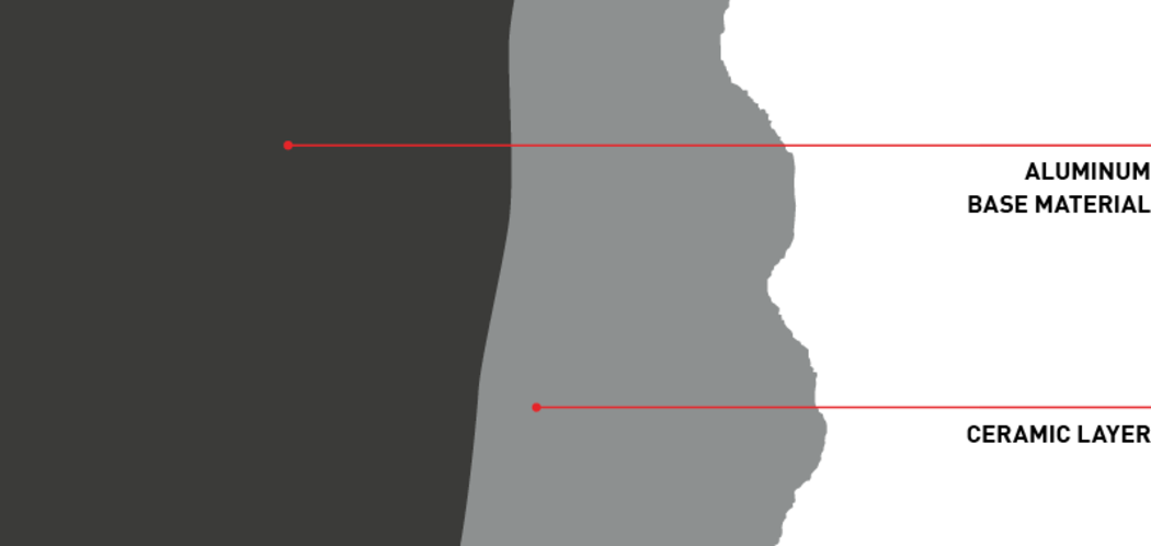 The ceramic layer is achieved similarly to anodizing, by submerging the rim in an electrolyte solution while applying an electrical tension between the rim as one electrode and the container as the other. The decisive difference between anodizing and OXiC lies in the millions of plasma discharges that occur between the electrolyte and the rim, applying high temperature and pressure on the developing oxide layer. Due to that, the developing oxide layer melts, flows and solidifies again. During this process the amorphous (not aligned) structure of the oxide converts to a crystalline (aligned) one. This is why OXiC is so hard and wear resistant.